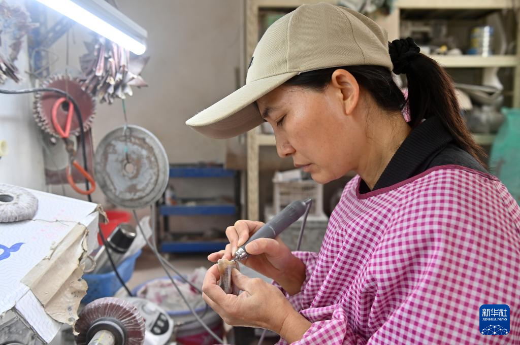 12月16日,工人在宾阳县武陵镇叶角匠梳艺馆加工牛角制品。